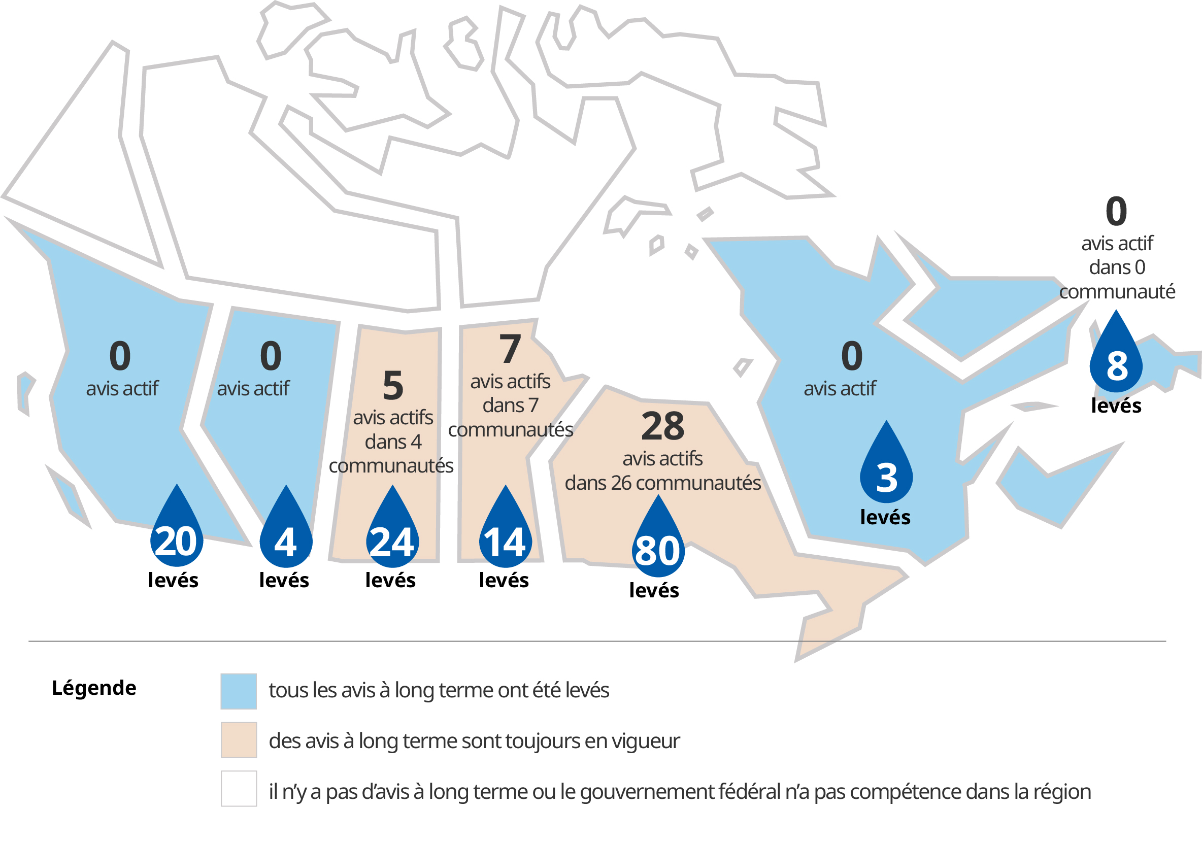 Pour obtenir les dernières nouvelles sur les avis à long terme, les statistiques actuelles et des informations sur la façon dont les avis à long terme sont traités, consultez le site : Lever les avis à long terme concernant la qualité de l'eau potable.