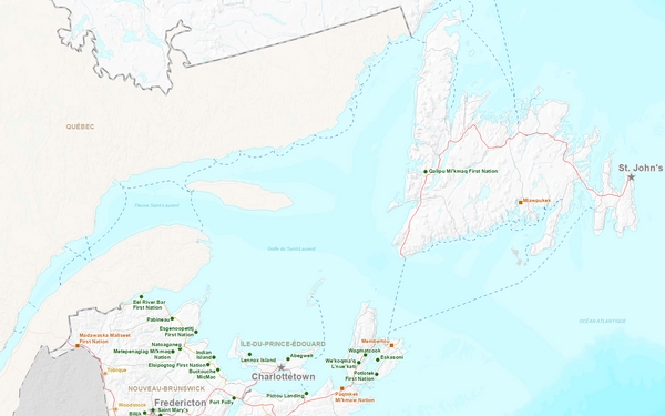 Carte des communautés des Premières Nations en région de l'Atlantique (PDF, 2,5 Mo)