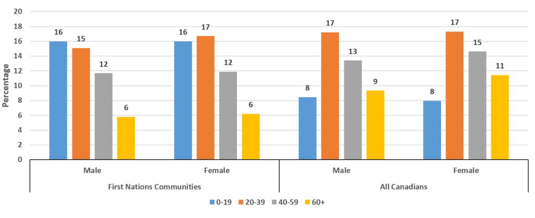 Text alternative for Figure 3. Percentage of positive COVID-19 cases in First Nations by age group and sex compared to all cases in Canada, 2020.