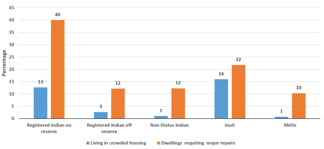 Text alternative for Figure 4. Percentage of Indigenous housing deemed crowded or in need of major repair, Canada, 2016.