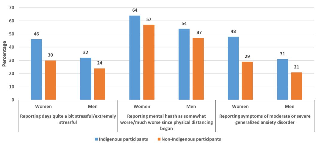 As seen in Figure 5, reports of worsening mental health are particularly high amongst Indigenous respondents. Compared to Indigenous men, Indigenous women were more likely to report having their mental health impacted since the start of physical distancing with 46% reporting that their days are quite a bit or extremely stressful and 48% reporting symptoms consistent with moderate or severe generalized anxiety disorder.Footnote 89