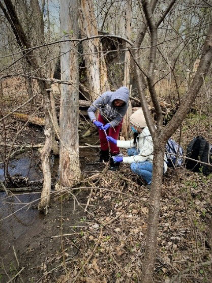 Crédit photo : Isabelle-Anne Bisson, TerraHumana Solutions. Valerie Gabriel (à gauche) et Tianai Zhou (à droite) prélèvent des échantillons d’eau dans un cours d’eau situé dans l’une des zones prioritaires ciblées par les membres de la communauté de Kanesatake.
