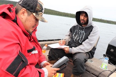 Crédit photo : Water First. Les stagiaires de Water First, Lawrence Mameanskum et Kabimbetas Noah Mokoush (à droite), recueillent des données sur la qualité de l’eau des lacs pendant l’étude de référence.