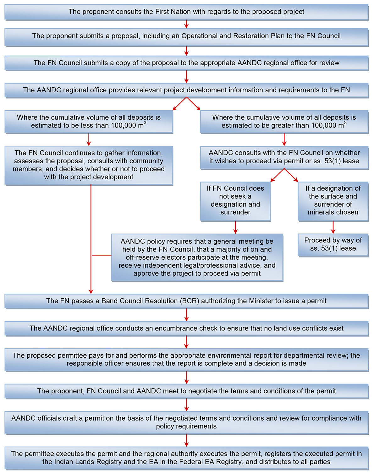 The major participants in on-reserve unconsolidated non-metallic substances development are the proponent, the permittee/lessee, the First Nation and AANDC. In some cases, the proponent and permittee/lessee may in fact be the same person or company. In other cases, the proponent and permittee/lessee may be separate parties.