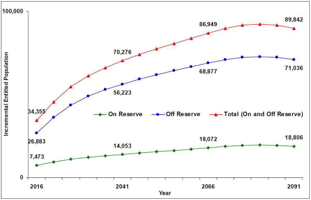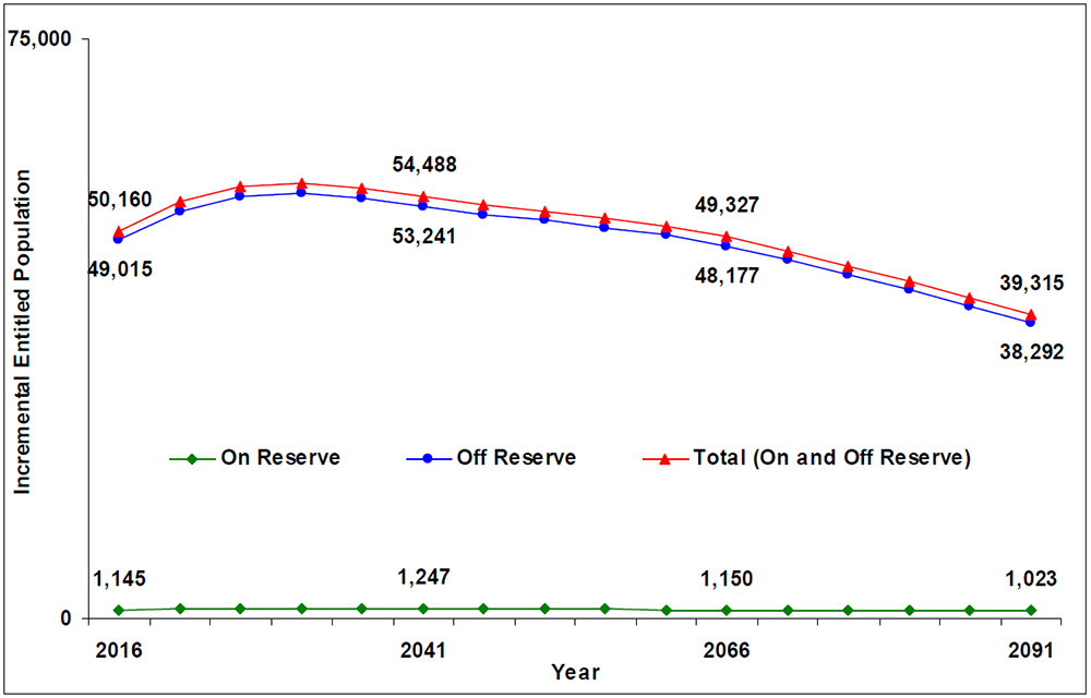 The research conducted for the Descheneaux litigation estimated the total 2006 population entitled to registration under the remedy to be 1,969,554, an incremental increase of 1,241,292 individuals in relation to the 2006 Census registered Indian population. In relation to the 2006 estimate, the incremental population estimated for 2016 (in this study) is roughly 6% higher.Footnote 18 The 2016 estimate of the incremental population (for this scenario) was also roughly 6% higher than the estimate prepared previously for 2011.