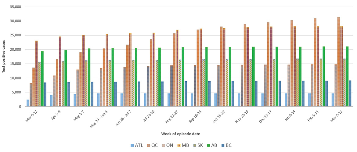 The episode date corresponds to the earliest date reported according to the following order: symptom onset date, specimen collection date, laboratory result date, date reported to ISC.