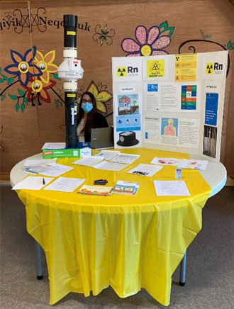 Photo courtesy of Deana Sappier. Reni Bear, community coordinator is featured in this photo and presented the radon project at the Neqotkuk Health Centre Community Health Fair held on May 31, 2022 to promote Neqotkuk Tobique First Nation’s services.