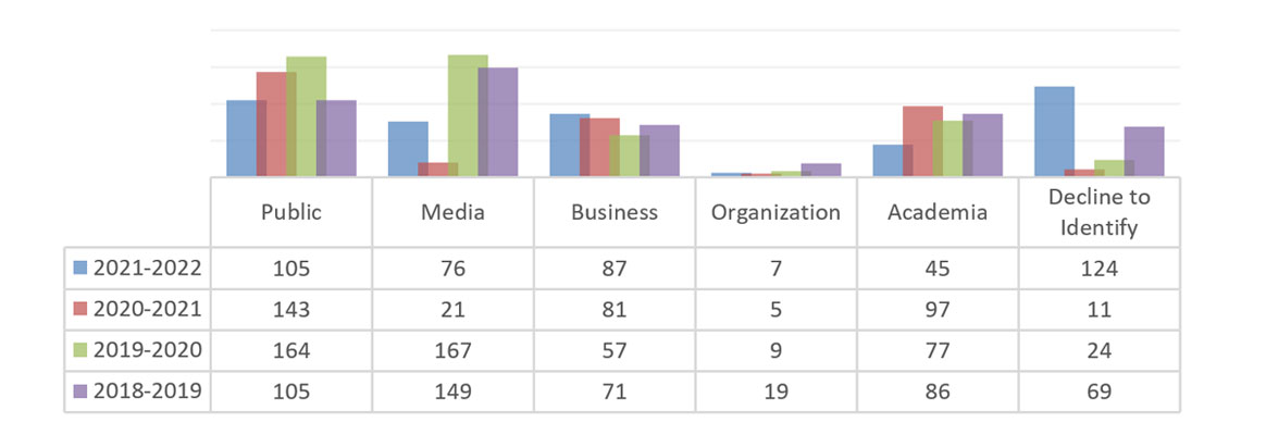 For 2021-2022, ATIP received one-hundred-five (105) requests from the public, seventy-six (76) requests from media, eighty-seven (87) from business organisations, seven (7) from other organisations, forty-five (45) from academia, and one-hundred-twenty-four (124) who declined to identify.