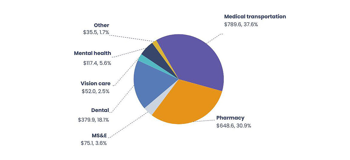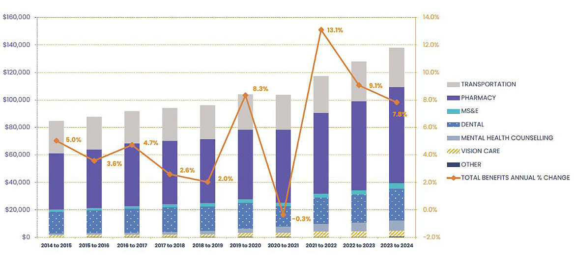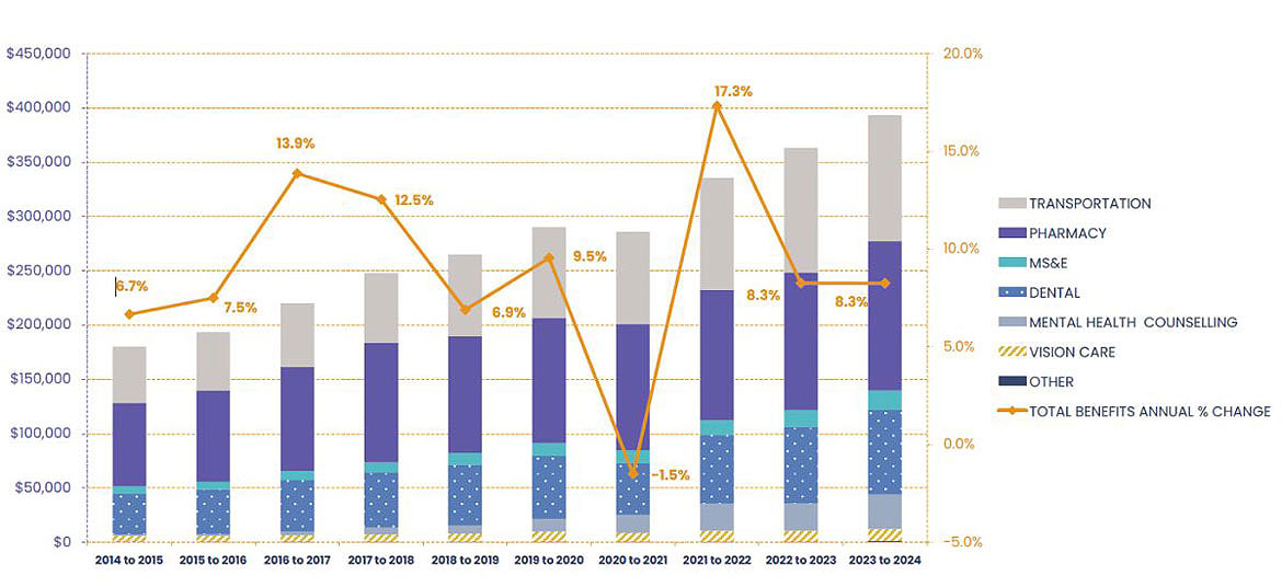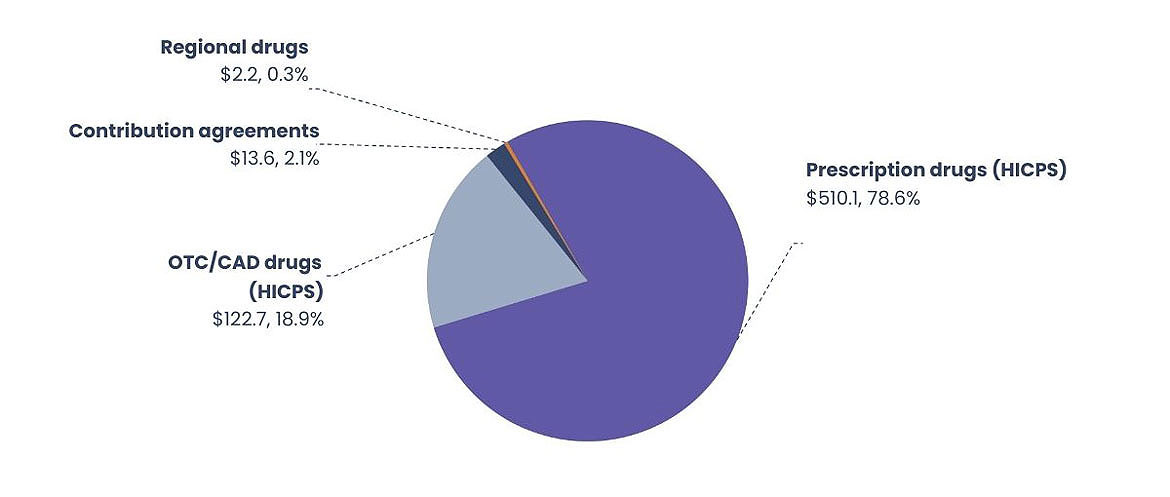 Starting in 2023 to 2024, expenditures relating to administration of the HICPS contract are being reporting only at the program level. As such, historical values reported for individual benefits will not match those reported in previous editions of the NIHB Annual Report.