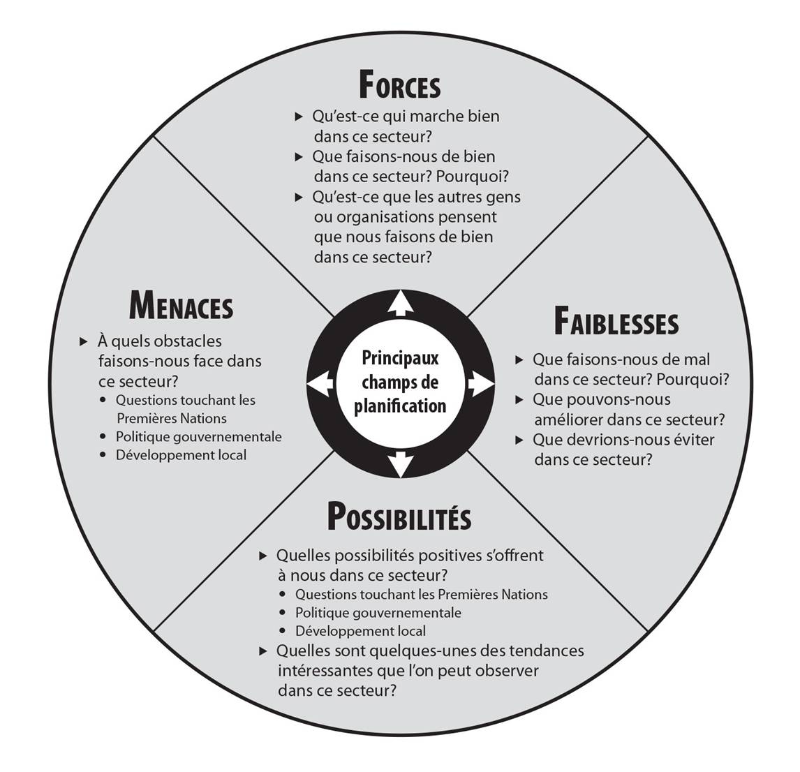 Détermination des forces, faiblesses, possibilités et menaces ayant un effet sur la capacité de l'organisme à atteindre sa vision et à accomplir sa mission.