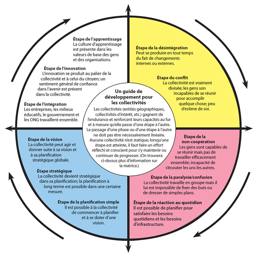 La planification communautaire globale est un processus holistique qui permet à une collectivité d’établir la marche à suivre pour parvenir à la viabilité et à l’autosuffisance et développer ses capacités de gouvernance.