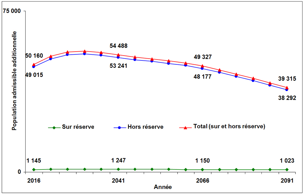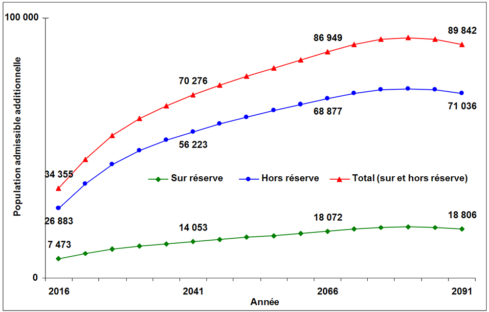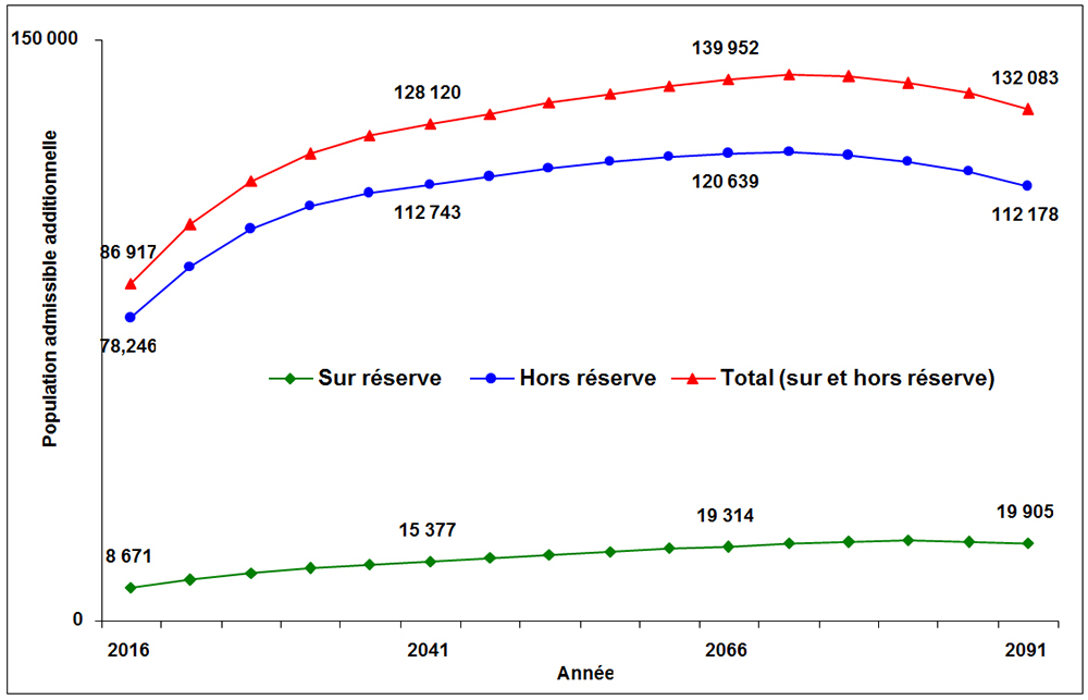 | Scénario | Population visée | Population totale potentiellement admissible en 2016 | Estimation de la population supplémentaire en 2016 (par rapport au nombre d'Indiens inscrits déterminé dans le cadre du Recensement) | ||||