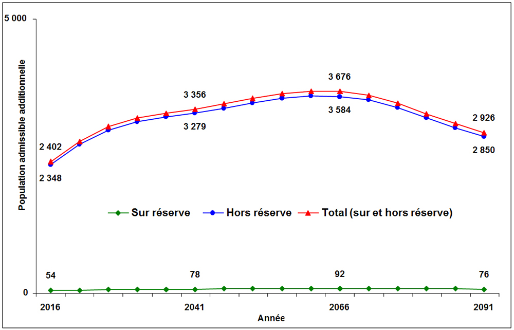 | Scénario | Population visée | Population totale potentiellement admissible en 2011 | Estimation de la population supplémentaire en 2011 (par rapport au nombre d'Indiens inscrits déterminé dans le cadre de l'ENM) | ||||