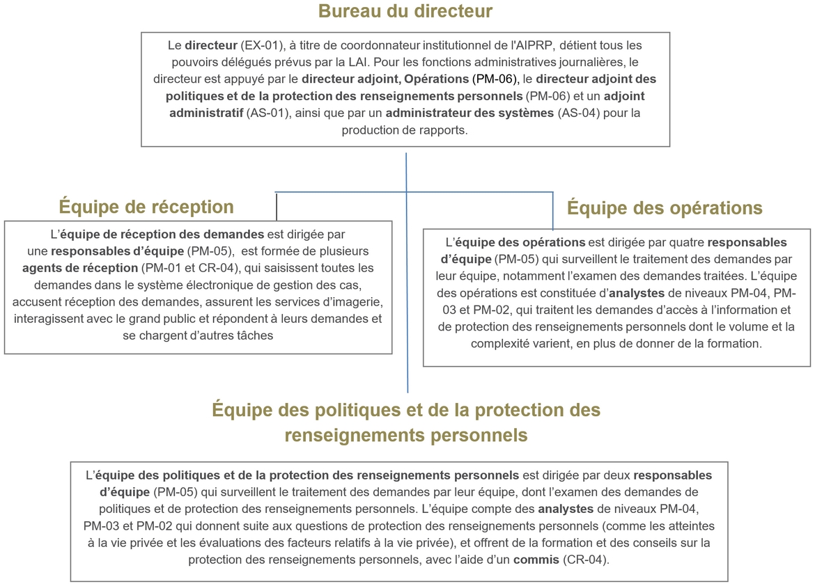 Le directeur (EX-01), à titre de coordonnateur institutionnel de l'AIPRP, détient tous les pouvoirs délégués prévus par la LAI. Pour les fonctions administratives journalières, le directeur est appuyé par le directeur adjoint, Opérations (PM-06), le directeur adjoint des politiques et de la protection des renseignements personnels (PM-06) et un adjoint administratif (AS-01), ainsi que par un administrateur des systèmes (AS‑04) pour la production de rapports.