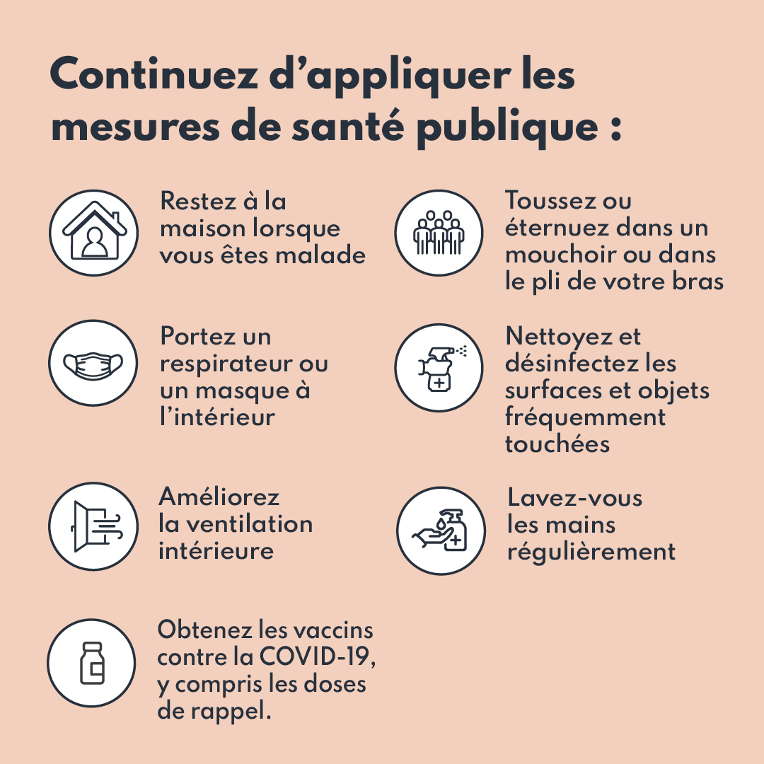 Continuez de vous protéger et de protéger les autres en appliquant plusieurs mesures de santé publique et faites-vous vacciner si vous êtes admissible.