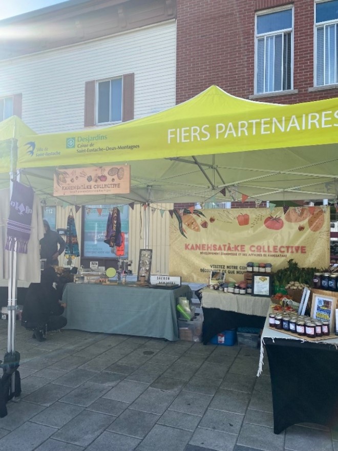 Le kiosque du Kanehsàta:ke Collective lors d'un événement dans la ville de Saint-Eustache.