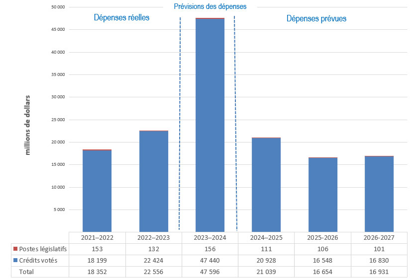 Explication du tableau 12 : Dépenses Les dépenses totales pour 2024-2025 sont prévues à 24 583 millions de dollars, ce qui représente une augmentation de 707 millions de dollars par rapport aux dépenses totales prévues l'année précédente de 23 876 millions de dollars. Les dépenses par responsabilité essentielle sont les suivantes :