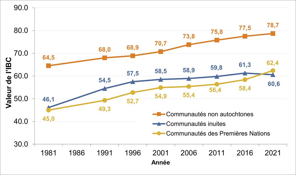 Au cours de la période de 40 ans s'étalant de 1981 à 2021, les valeurs globales de l'IBC pour les communautés des Premières Nations, des Inuit et des non autochtones ont enregistré une hausse (voir la Figure 1). Pendant cette période, les valeurs globales de l'IBC ont augmenté de 45,0 à 62,4 pour les communautés des Premières Nations. Le résultat de 2021 pour ces communautés surpasse celui de 2016 (58,4) de 4,0 points, ce qui représente une amélioration notable du bien-être socioéconomique. Cette avancée constitue l'amélioration la plus substantielle pour les communautés des Premières Nations enregistrée entre les recensements consécutifs au cours des 4 dernières décennies.