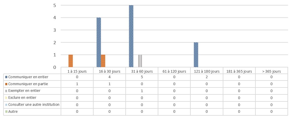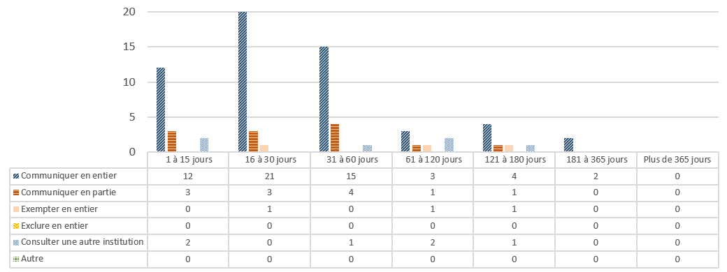 | Nombre de jours de retard au-delà des délais prévus par la Loi | Nombre de demandes fermées au-delà des délais prévus par la Loi où aucune prorogation n'a été prise |